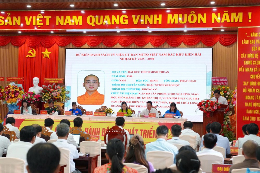 Một trong những nhiệm vụ trọng tâm của Đại hội là hiệp thương bầu Ủy ban MTTQVN Đặc khu Kiên Hải khóa I, nhiệm kỳ 2025 – 2030. Đại hội đã hiệp thương bầu Ủy ban gồm 47 vị; đồng thời bầu Ban Thường trực gồm 6 vị, trong đó có 01 Chủ tịch và 05 Phó Chủ tịch (01 Phó Chủ tịch kiêm Chủ tịch Hội Nông dân, 01 Phó Chủ tịch kiêm Chủ tịch Hội Liên hiệp Phụ nữ). Đại hội cũng cử đoàn Đại biểu đi dự Đại hội MTTQVN tỉnh An Giang lần thứ I, nhiệm kỳ 2025 – 2030. Theo đó, đại diện cho Phật giáo, Đại đức Thích Minh Thuận – Cán bộ Văn phòng 2 Trung ương, Phó Thư ký Ban Trị sự GHPGVN tỉnh An Giang – được tín nhiệm bầu vào Ủy viên Ủy ban MTTQVN Đặc khu Kiên Hải.