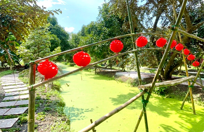 Vườn cây trái trĩu quả tươi mát, tiếng chim hót trên cây, cá dưới ao bèo xanh mướt tung tăng bơi lội tất cả như bỏ lại cái bụi bặm, hối hả ồn ào của phố thị phía sau. Bạn có thể vươn vai, hít một hơi thật dài để cảm nhận luồng không khí trong lành ùa vào cơ thể mình. Con người như hoà mình vào thiên nhiên, bình yên và nhẹ nhàng đến lạ.