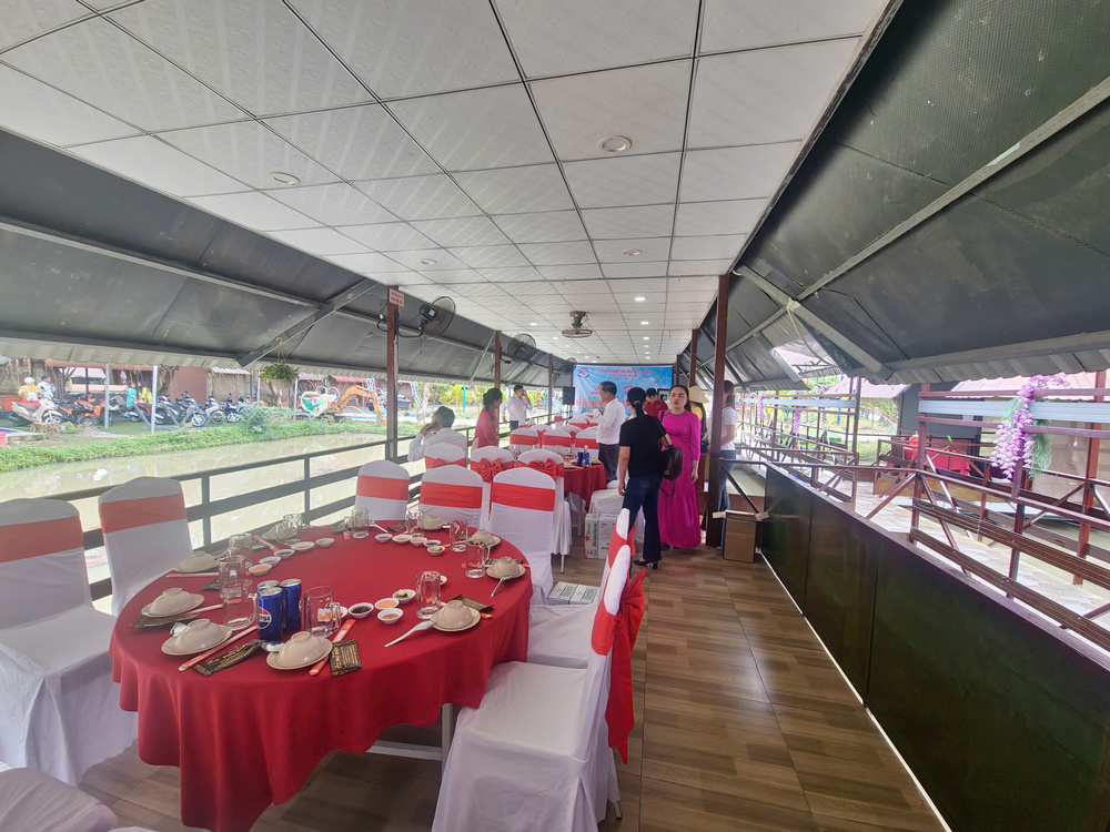 Buổi tiệc Liên hoan Bế giảng lớp TCLLCT K130 được tổ chức trong không gian rộng rãi, thoáng đãng của Khu du lịch Phú Điền, nơi mang lại sự thoải mái và gắn kết cho tất cả mọi người. Cảnh quan xanh mát, không khí trong lành giúp khách mời dễ dàng kết nối, gần gũi với thiên nhiên, tạo nên một bầu không khí vừa trang trọng vừa thân mật. Bàn tiệc được bày trí tinh tế với gam màu đỏ – trắng nổi bật, ghế phủ nơ đồng bộ, mang đến vẻ sang trọng nhưng vẫn giữ được sự ấm cúng cho buổi lễ.