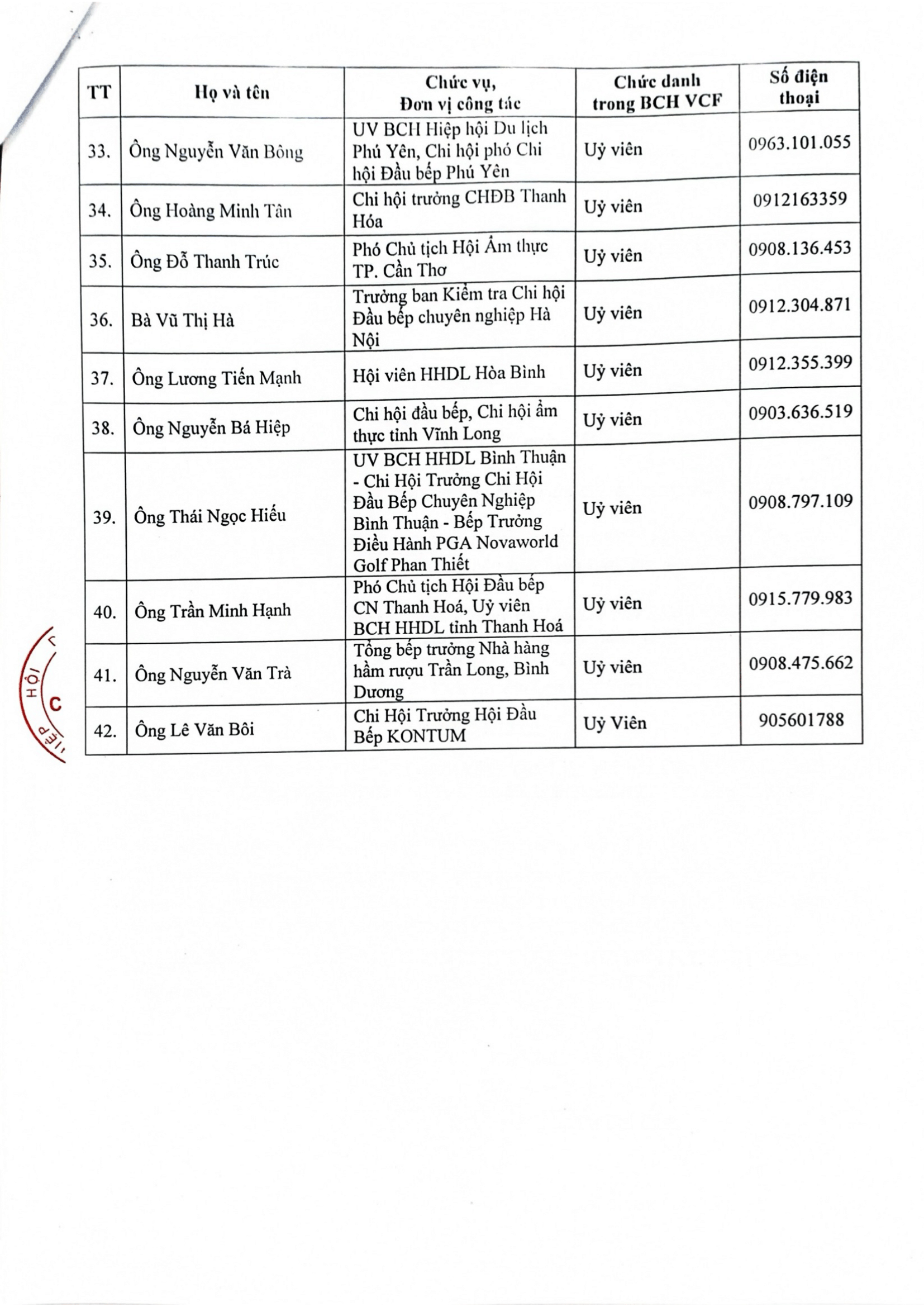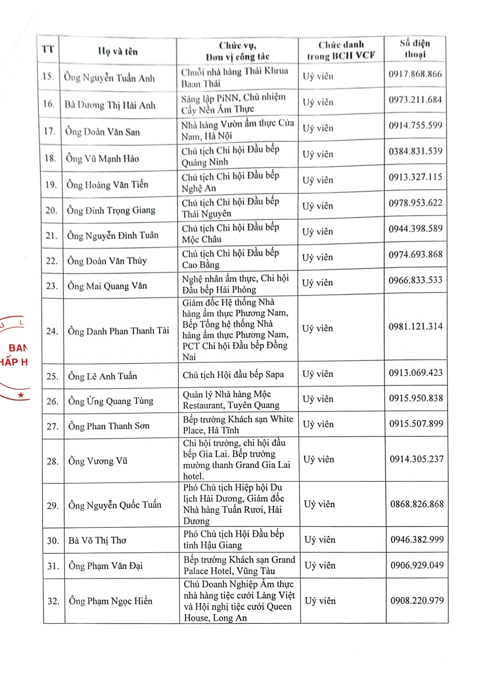 Danh sách ban chấp thành lâm thời liên chi hội đầu bếp Việt Nam