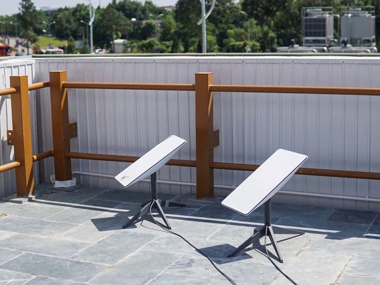 Hai ăng ten thu phát sóng internet vệ tinh Starlink thử nghiệm tại khu vực Hòa Lạc, Hà Nội. Ảnh: Lưu Quý