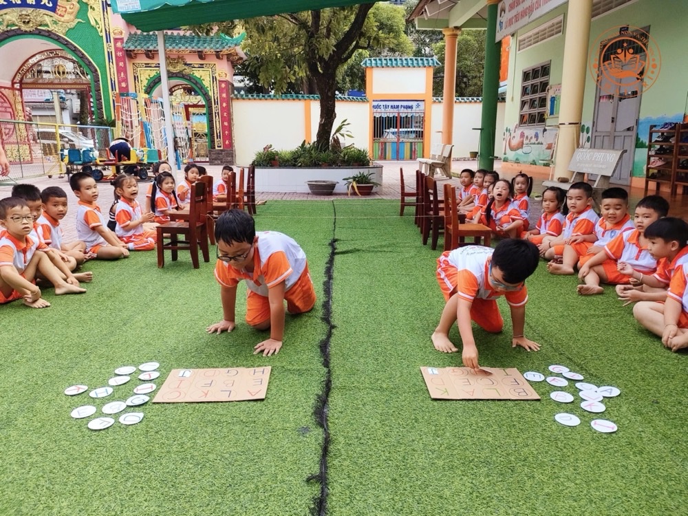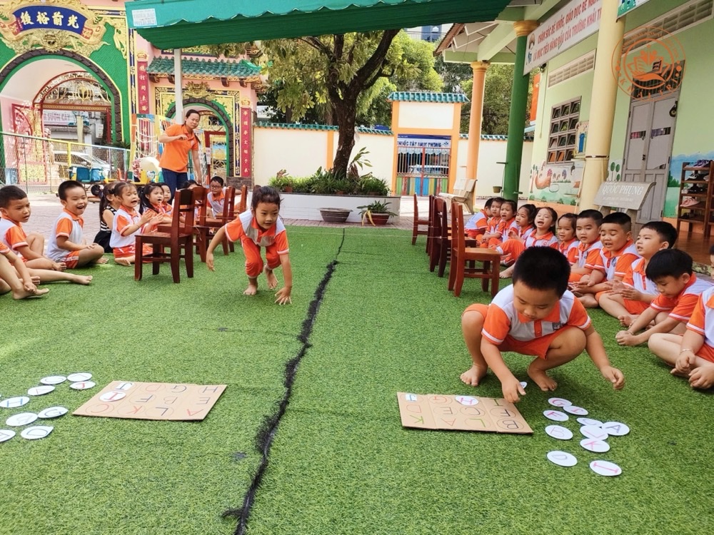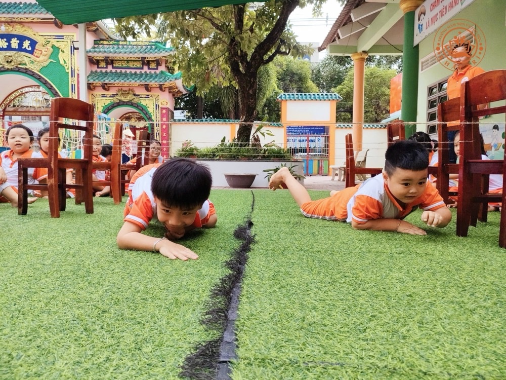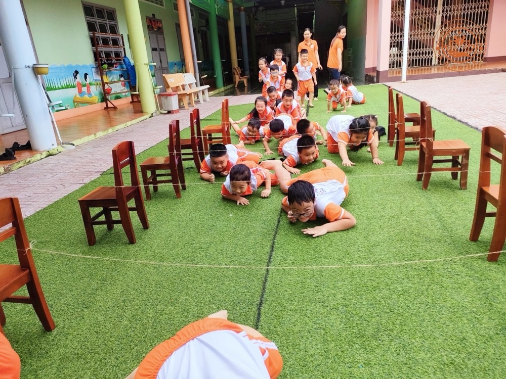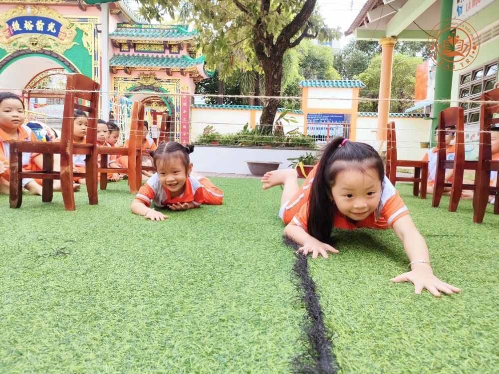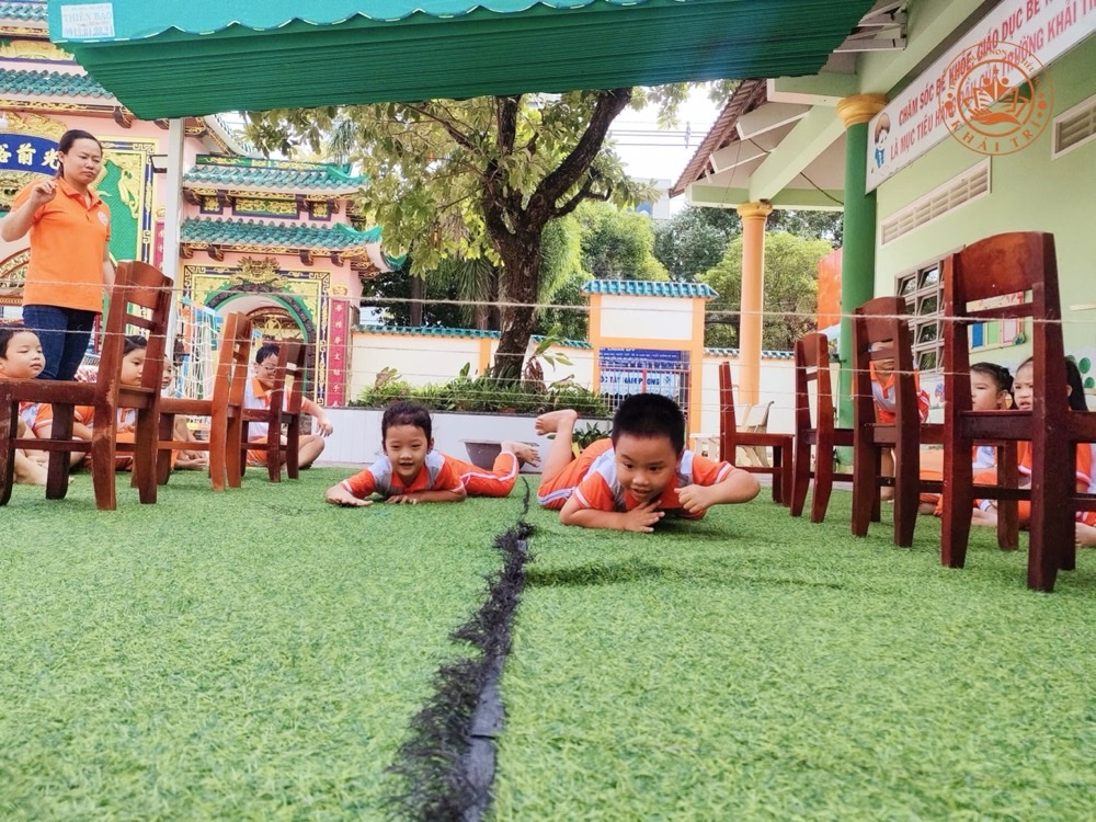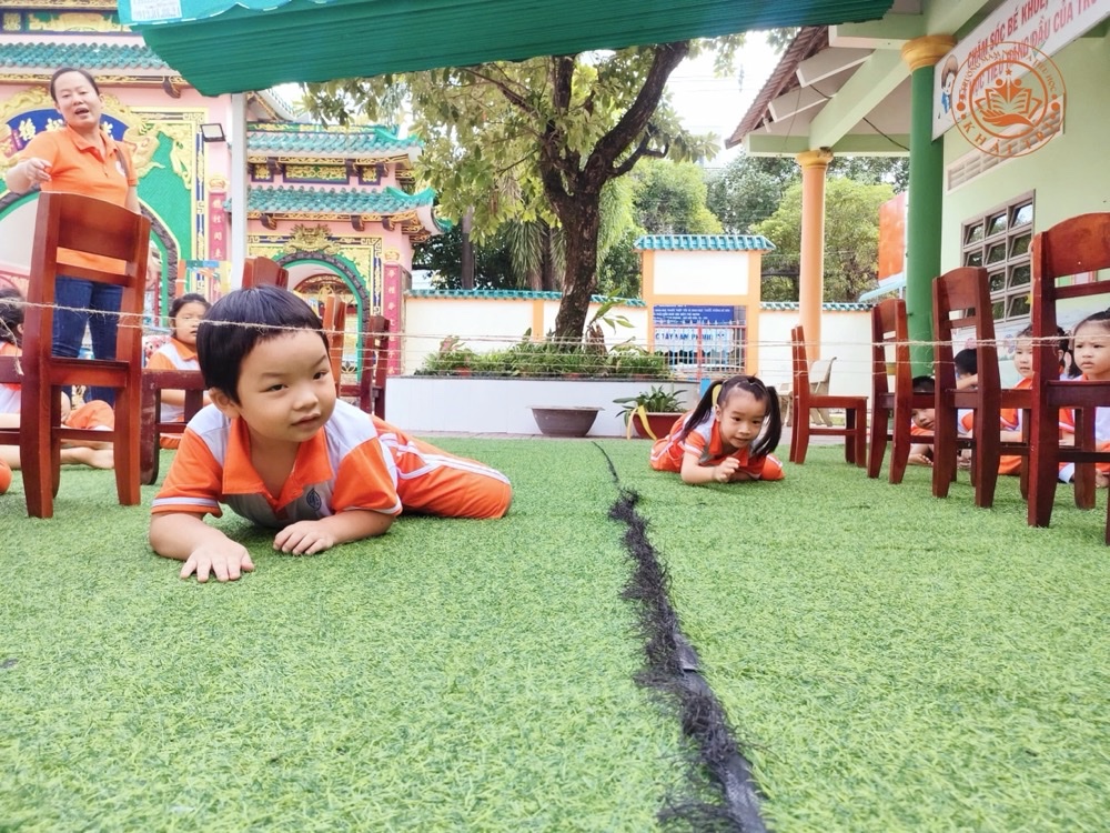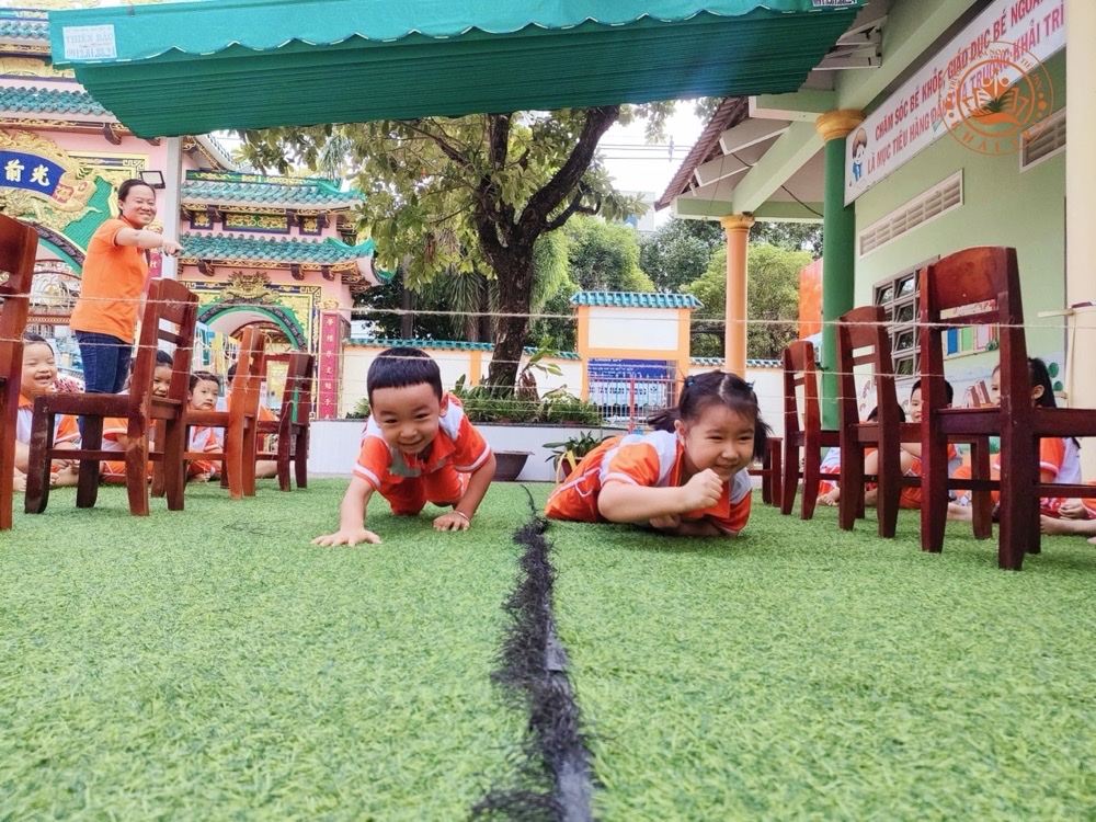 Trong hoạt động này, các bé được chia thành hai nhóm, cùng nhau vượt qua những chướng ngại vật là những sợi dây được giăng lên. Việc trườn qua dây đòi hỏi sự khéo léo và nhanh nhẹn, khiến các bé cùng phải tập trung cao độ. Sau khi vượt qua chướng ngại vật, nhiệm vụ tiếp theo của các bé là phải nhanh chóng tìm đúng chữ cái theo yêu cầu của cô giáo.