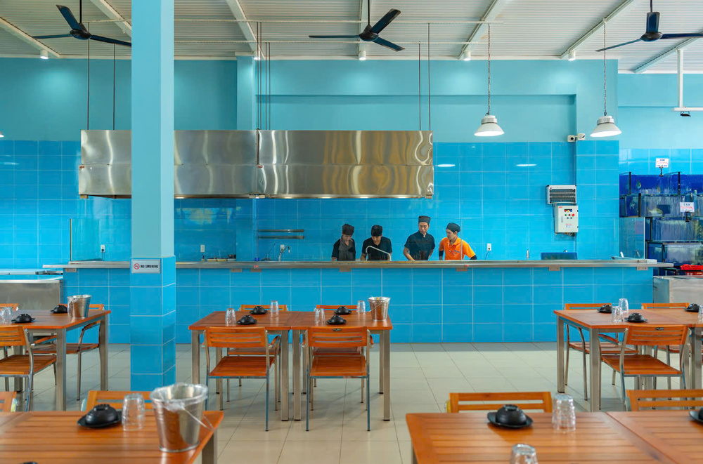 Không gian được chia thành khu ngoài trời sát bãi cát và phòng máy lạnh rộng rãi, kèm bể hải sản lớn để khách tự tay chọn nguyên liệu. Bếp mở luôn “khoe” sự sạch sẽ, dịch vụ thân thiện có sẵn ghế cho trẻ em, giúp bữa ăn trở nên vừa sang trọng vừa gần gũi giữa khung cảnh biển xanh và gió mát.