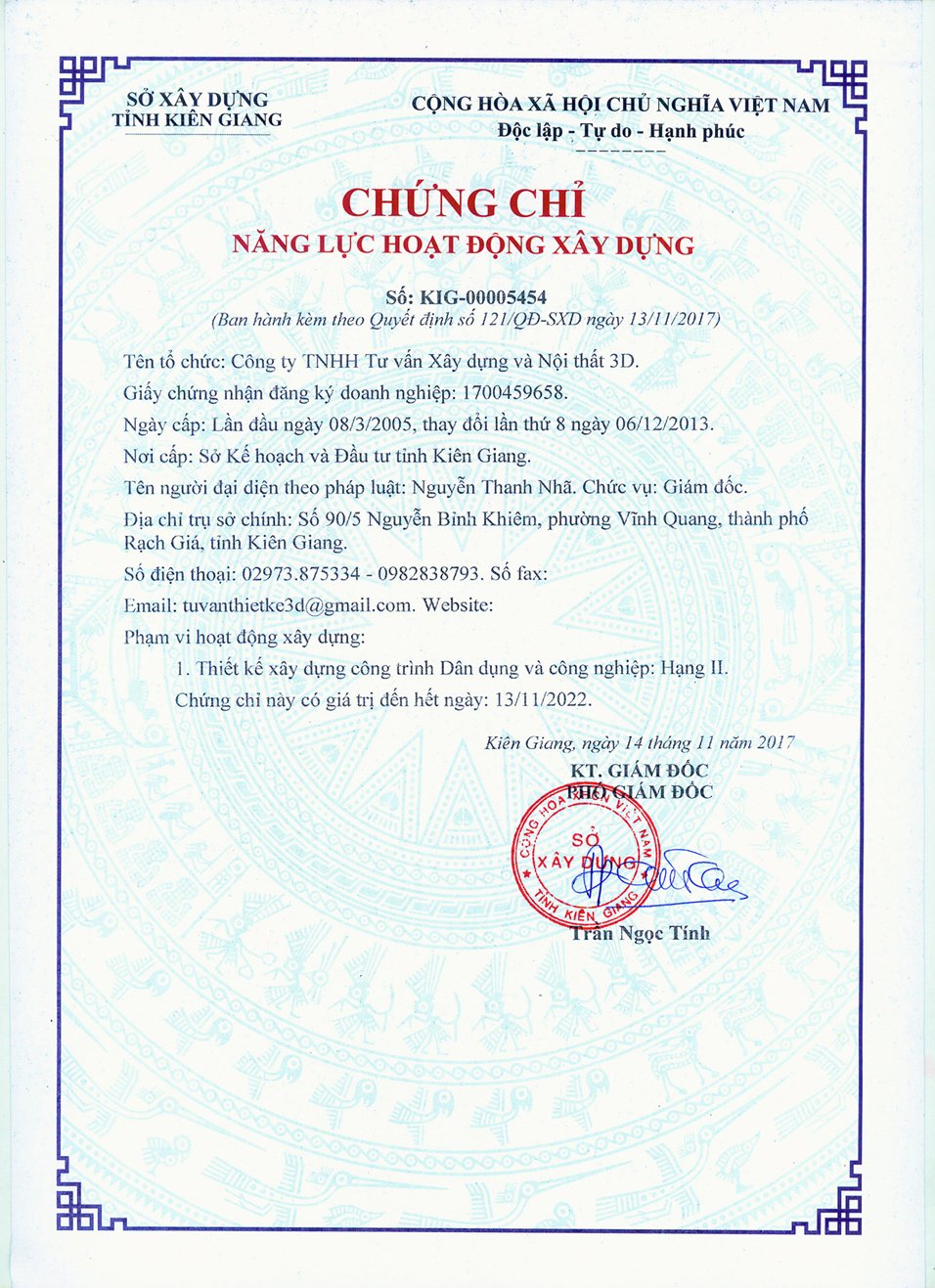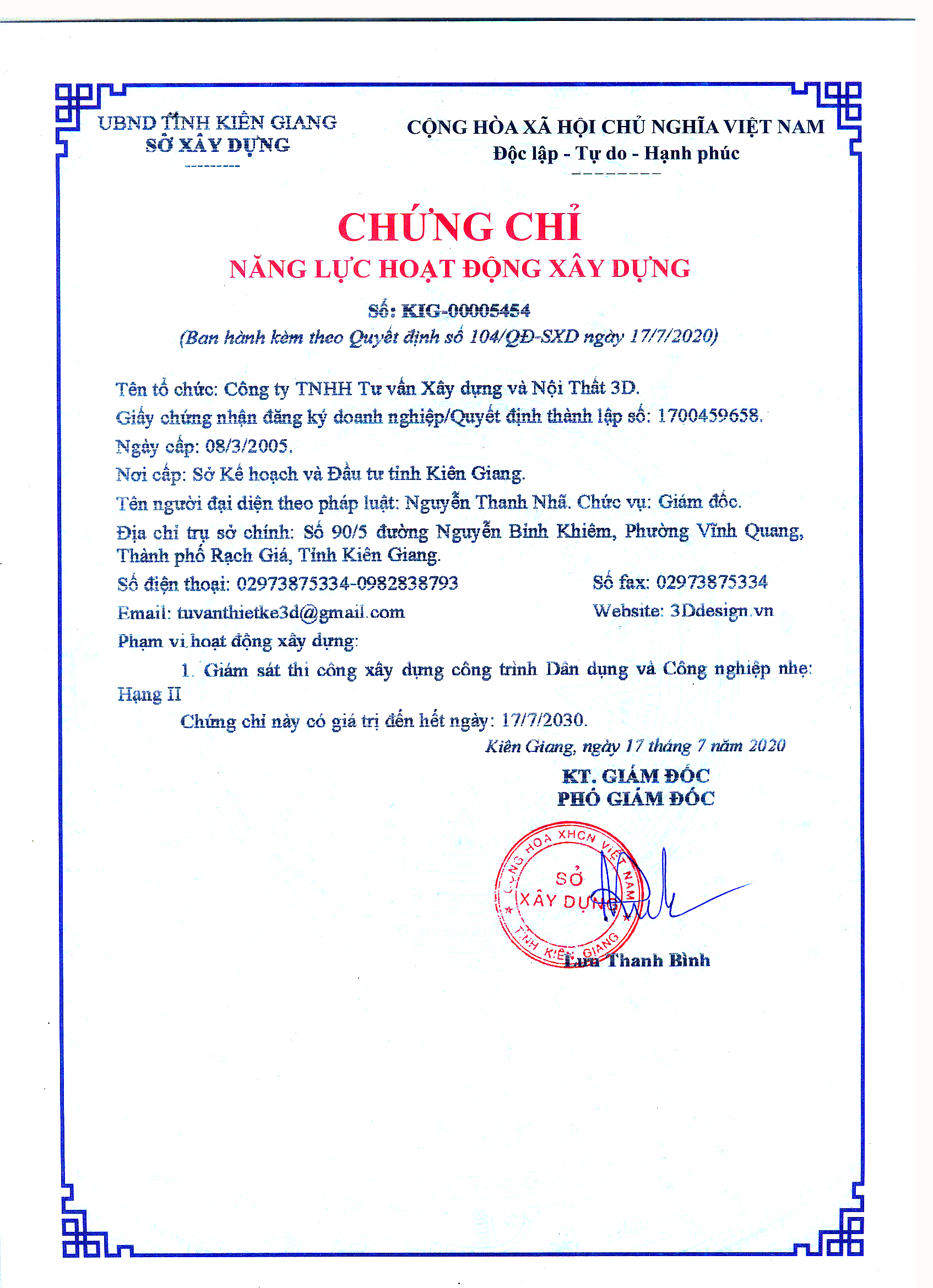 Công ty CÔNG TY TRÁCH NHIỆM HỮU HẠN TƯ VẤN XÂY DỰNG VÀ NỘI THẤT 3D được thành lập vào ngày 08 tháng 03 năm 2005, Với nhiều năm kinh nghiệm trong lĩnh vực xây dựng.